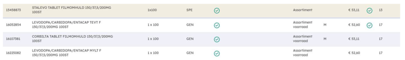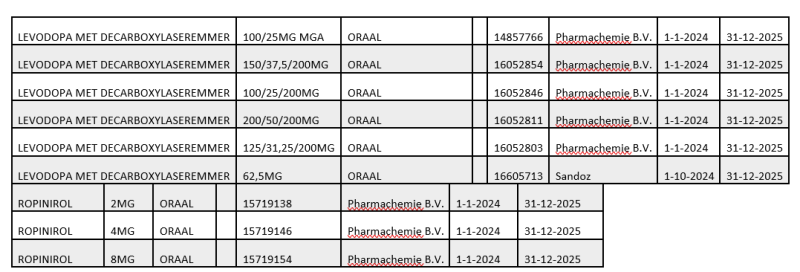 Het lijkt me verstandig de Stalevo en levodopa/carbidopa op één vast merk te houden en dit niet te wisselen onder een Medische Noodzaak. De ropinirol wisseling is begrijpelijk minder prettig, steeds andere strips, maar dat is moeilijk onder een Medische Noodzaak te scharen. Dus dat zou ik wel willen handhaven.